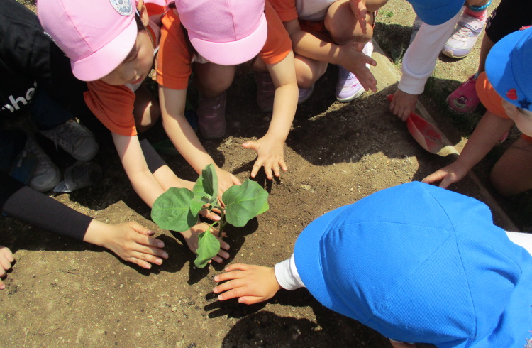 2歳児の子どもたちが、夏野菜の苗を植えました。「きゅうり?」苗を見ただけではまだまだわからない子どもたちですが興味津々。深めのプランターに穴を掘り、苗をポコッと入れた後、土の布団をかけてたっぷりお水をあげました。大きく育って、きゅうりができるのが楽しみです。