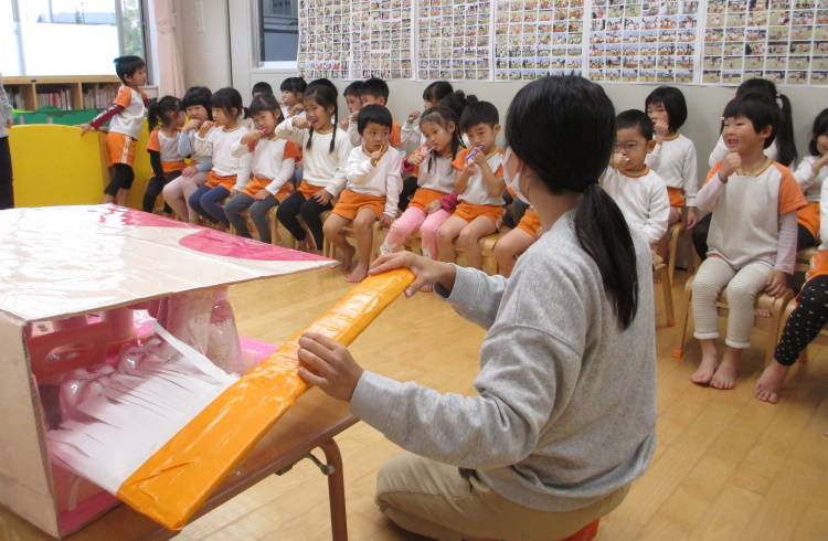 看護師より、絵本やパネルシアターを使って、熱中症についての話がありました。暑さにまだ慣れていないこの時期、水分を十分摂ること、汗をかいたら拭いたり着替えたりすること、外に出かけるときには帽子をかぶること、休息の大切さなど、これから来る夏を元気に乗り切るための大切なお話でした。