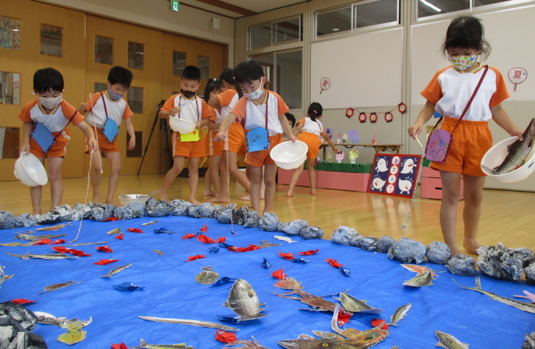 美味しいものがいっぱいの秋・・・給食でも秋の味覚を堪能です。給食室の先生から、手作りの模型を使ってさんまの体の仕組みを教えてもらいました。今日のメニューはさんまの塩焼き。5歳児は、1匹丸ごとのさんまを骨に気をつけながら美味しくいただきました。