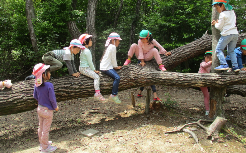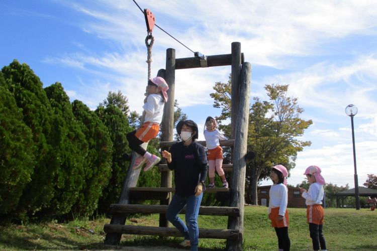 園庭での一場面。4歳児さんが雲梯に挑戦している様子を、憧れのまなざしで見つめている3歳児の子どもたち。「すご~い!」と思わず拍手を送る姿が印象的でした。いろいろな年齢の子どもたちが一緒に過ごす中での自然な関わり・・・微笑ましいですね。