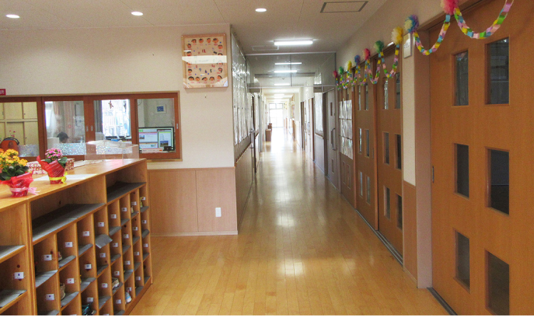 こども園の玄関を入ると、職員手作りのイチゴが出迎えてくれます。お迎えの時間には「イチゴみたい~!」という子どもたちのリクエストに応えて、保護者様が抱っこでイチゴを触らせてあげる姿も見られます。布や手作りのものって温かみと愛情がいっぱい感じられますね。