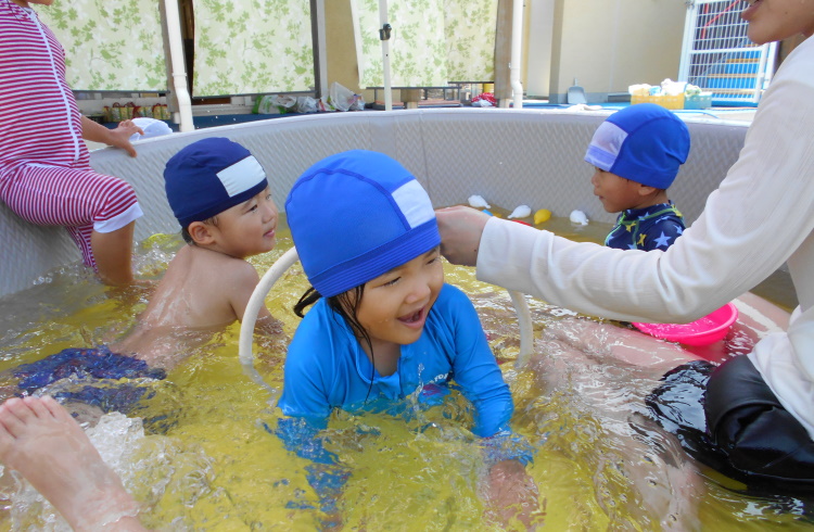 待ちに待ったプール開き!!保育者が「わにのお父さん♪」と歌い出すと水の中でワニ歩きしたり、水鉄砲で友だちと水を掛け合い楽しんでいました。「たのしかった」と笑顔いっぱいのプール遊びでした。
