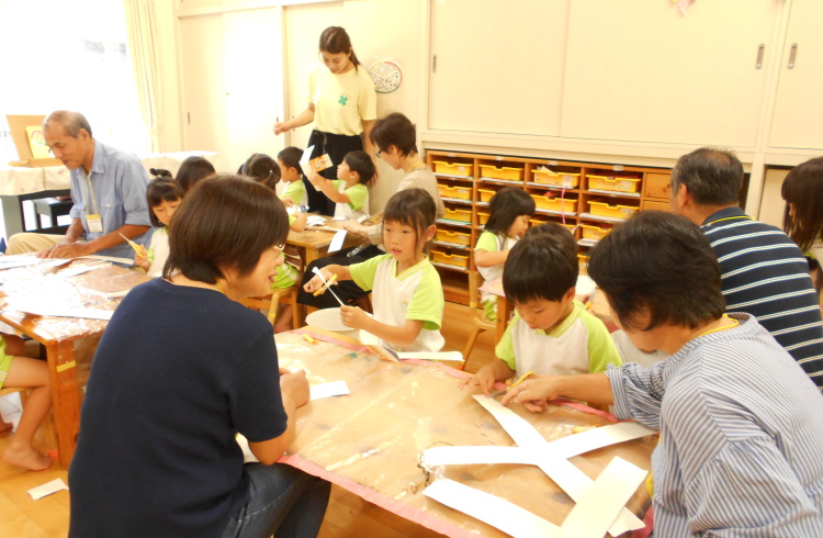 敬老参観で5歳児のおじいちゃんおばあちゃんが来てくれました。リズムはいつもより緊張していた子どもたちですが、動きに自信がみなぎっていましたよ。いつも頑張っている竹馬のお手伝いをしてもらったり、見てもらったり楽しい時間を過ごしました。