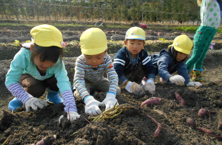 まちづくり協議会さんの畑にいちょう組が里芋の収穫へ行きました。親芋につく小芋を根気よくとっていましたよ。 大きな葉っぱを「トトロみたい」と傘さし楽しんでいました。