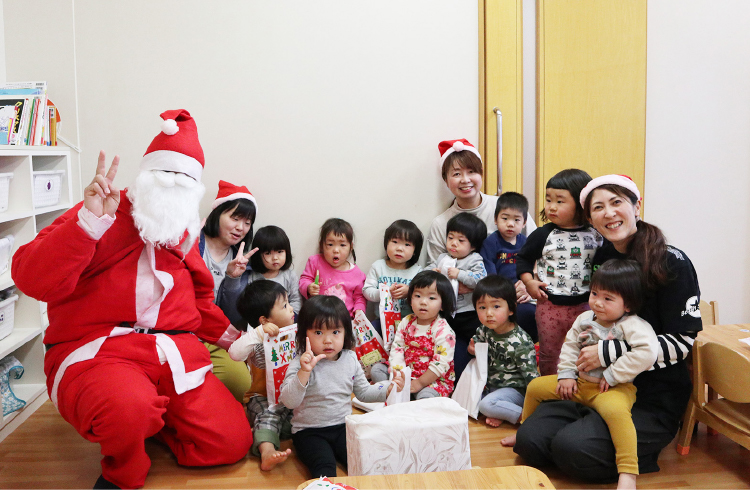 クリスマスパーティーでは、「5人兄弟のサンタクロース」のお話を見たり、サンタさんと一緒に歌をうたい楽しみました。 プレゼントをサンタさんからもらうと、とても嬉しそうにプレゼントの袋の中をのぞいていましたよ。